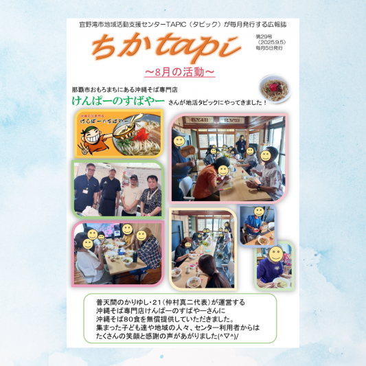 2025.09.26 お知らせ 広報誌 「🌿 宜野湾市地域活動支援センターTAPIC 2025年9月号」 を公開しました 広報誌 「🌿 宜野湾市地域活動支援センターTAPIC 2025.9月」 ↑ 🌈こちらをクリック ↑ 宜野湾市地域活動支援センターTAPICの広報紙を公開しました。(2025.9月号) 広報誌 「🌟 地域包括支援センター西部南広報紙 ゆいまーる 山久諸桃里 2025年9月号」 を公開しました (終了しました)依存症研修「希望に向かって歩むための動機づけ面接のスキル」10/7開催のお知らせ 記事一覧に戻る