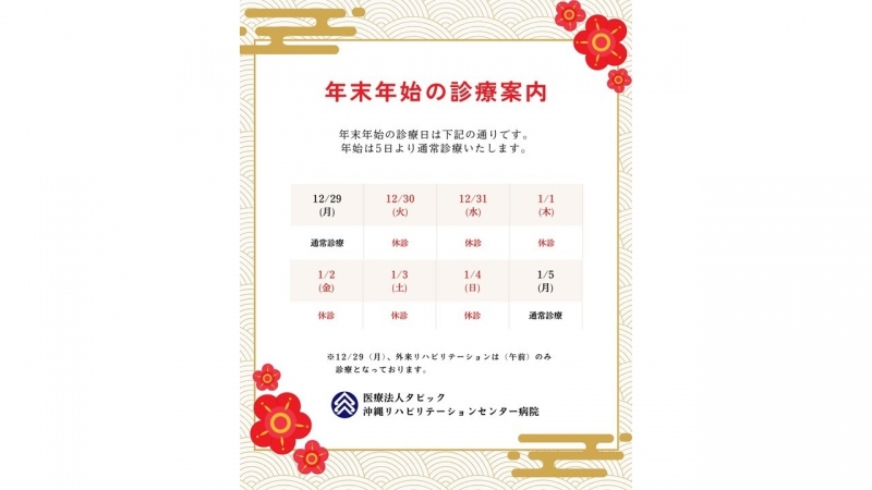 平素より、沖縄リハビリテーションセンター病院の診療にご理解、ご協力いただきありがとうございます。当院の年末年始の診療に関してお知らせいたします。