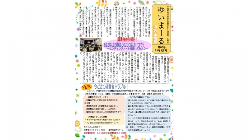 2026.03.16 お知らせ 広報誌 「🌟 地域包括支援センター西部南広報紙 2026年3月号」 を公開しました 🌟 地域包括支援センター西部南広報紙 ゆいまーる 山久諸桃里 2026年3月号 ↑ 🌈こちらをクリック ↑ 沖縄市で活動している地域包括支援センター西部南が発行している広報紙です。ぜひご覧ください。(2026.3月号) 沖縄市地域包括支援センター西部南についてはこちら 院内での撮影・録音等の禁止について 記事一覧に戻る