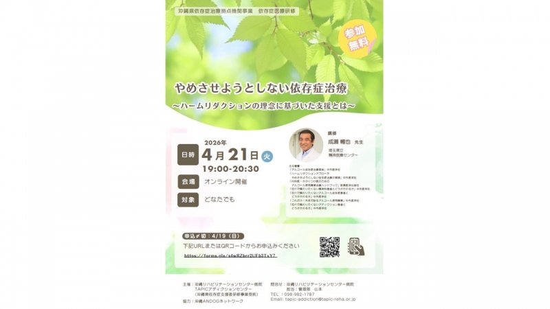 令和8年4月21日(火)に沖縄県依存症治療拠点機関事業 依存症医療研修を開催いたします。