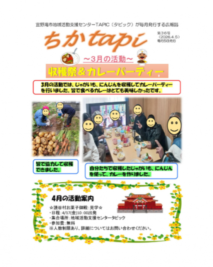 2026.04.09 お知らせ 広報誌 「🌿 宜野湾市地域活動支援センターTAPIC 2026年4月号」 を公開しました。 🌿 宜野湾市地域活動支援センターTAPIC 2026年4月号 ↑ 🌈こちらをクリック ↑ センターの活動や毎月のプログラムも掲載しています。 是非ご覧ください。 依存症医療研修「やめさせようとしない依存症治療」4/21開催のお知らせ 記事一覧に戻る
